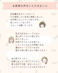 「よそのハーブソルトも試してみたけれど、やっぱり、ねもころさんのハーブソルトがいいと思って」